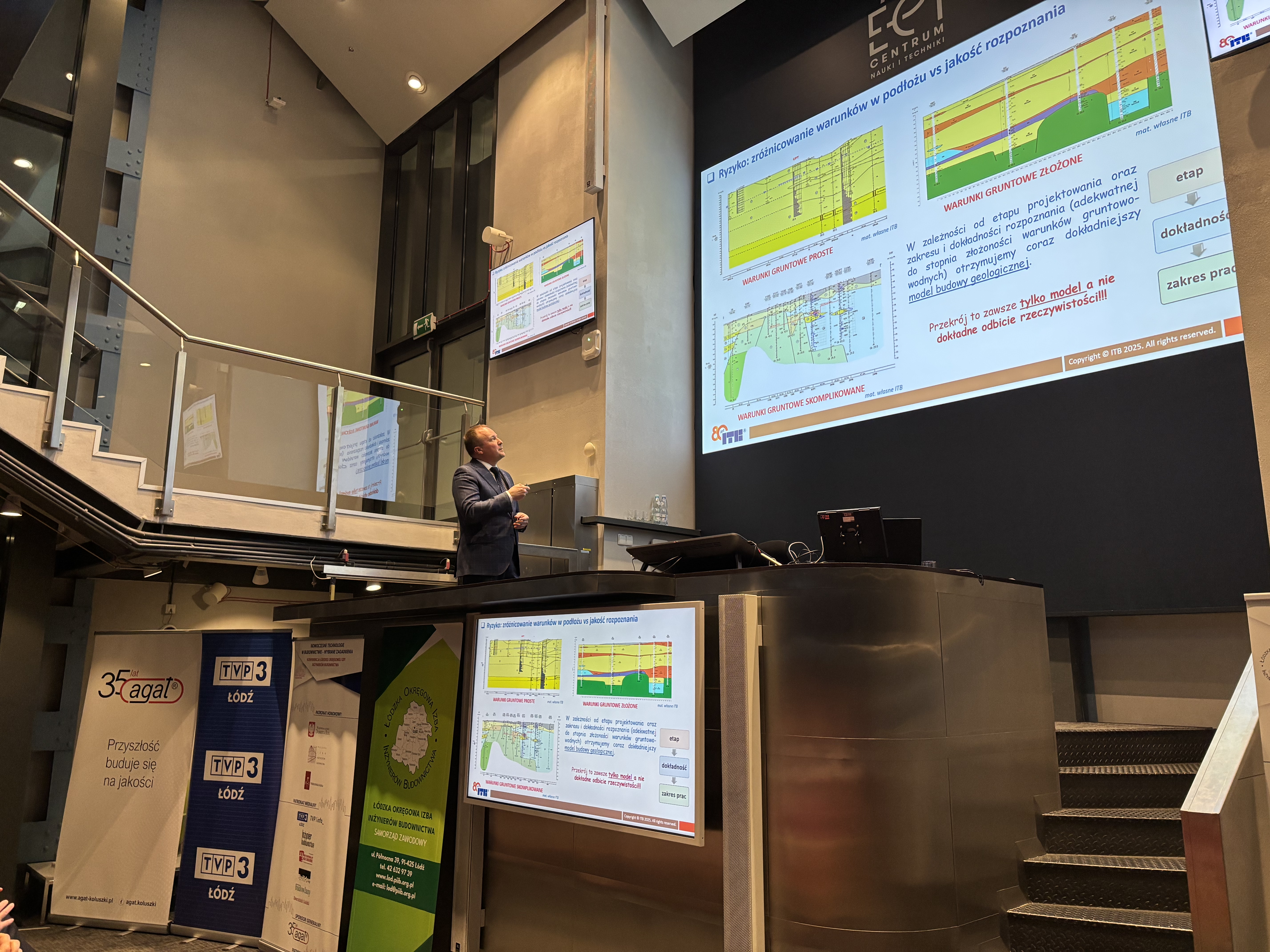 Jednym z kluczowych punktów programu pierwszego dnia był wykład inauguracyjny dr. hab. inż. Tomasza Godlewskiego, prof. ITB pt. „Bezpieczeństwo obiektów budowlanych w sąsiedztwie tuneli – nowe wyzwania dla budownictwa w Polsce”. W trakcie wystąpienia omówiono zagadnienia związane z oceną wpływu budowy tuneli na przemieszczenia podłoża oraz stan techniczny istniejącej zabudowy. Prelegent zwrócił także uwagę na znaczenie monitorowania prowadzonych robót i właściwego zarządzania ryzykiem w trakcie realizacji takich inwestycji.