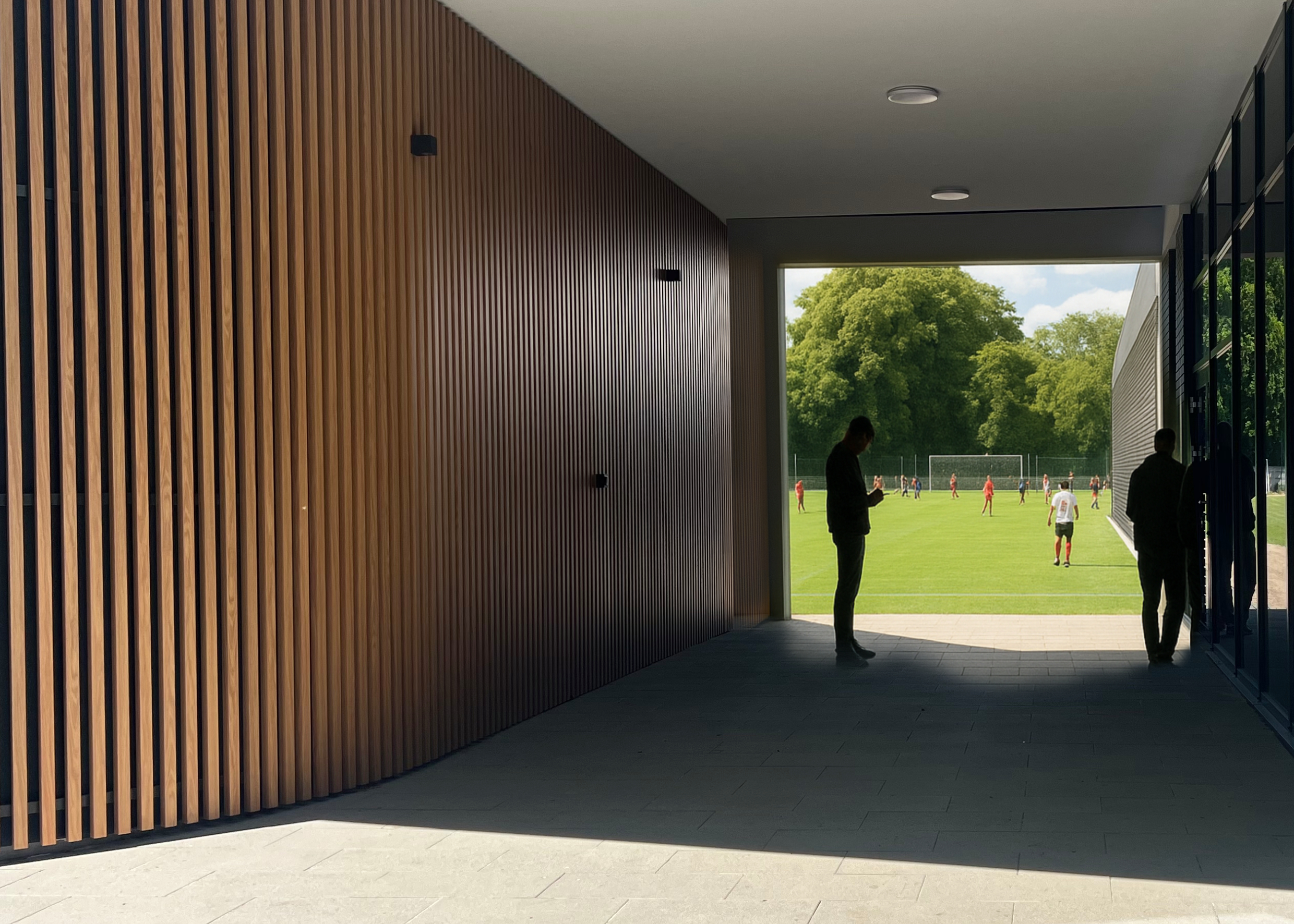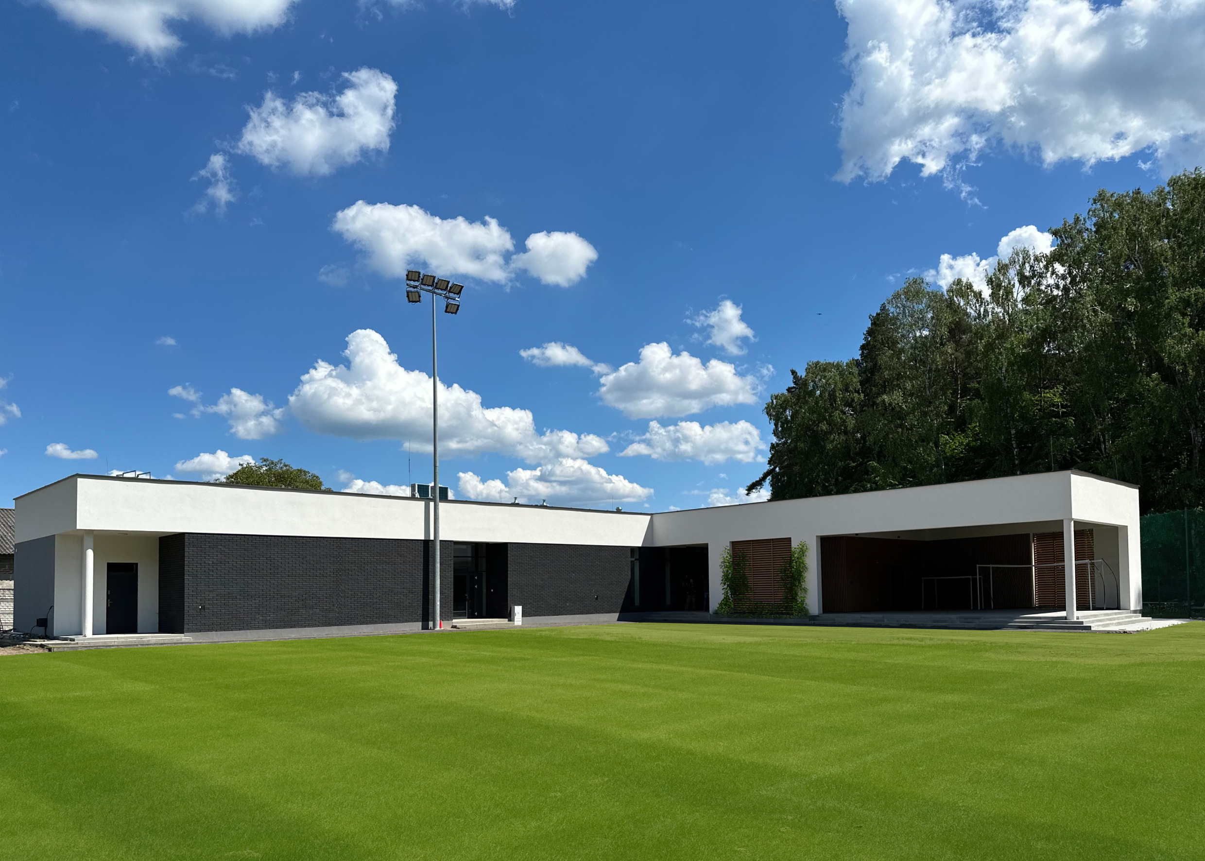 Budynek wyróżnia się elegancką i zarazem skromną formą architektoniczną. Zastosowano duże przeszklenia, elewację z paneli aluminiowych imitujących drewno oraz grafitowej cegły klinkierowej, co pozwoliło wpisać nowy obiekt w otaczający krajobraz wiejski i leśny. Wyraźnie zaakcentowane wejście, pełniące także funkcję bramy na teren boiska, podkreśla reprezentacyjny charakter inwestycji.